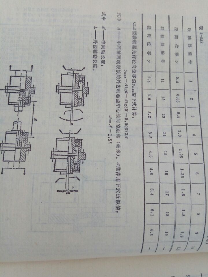 8.當(dāng)兩軸線無(wú)歪斜時(shí),CL型聯(lián)軸器允許徑向位移y值見表4-338.